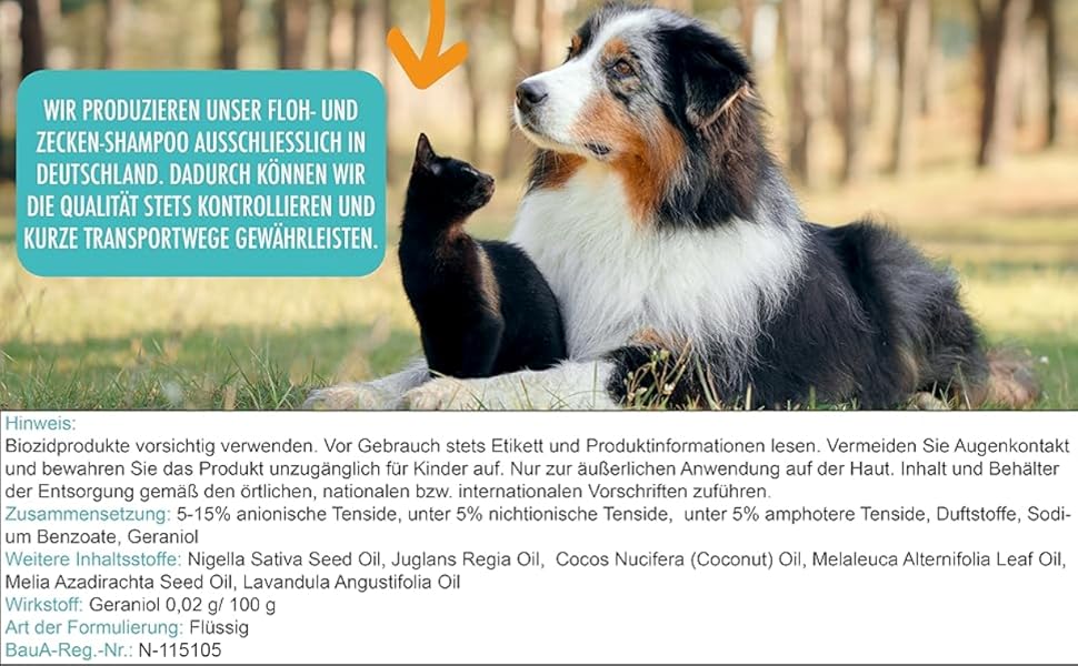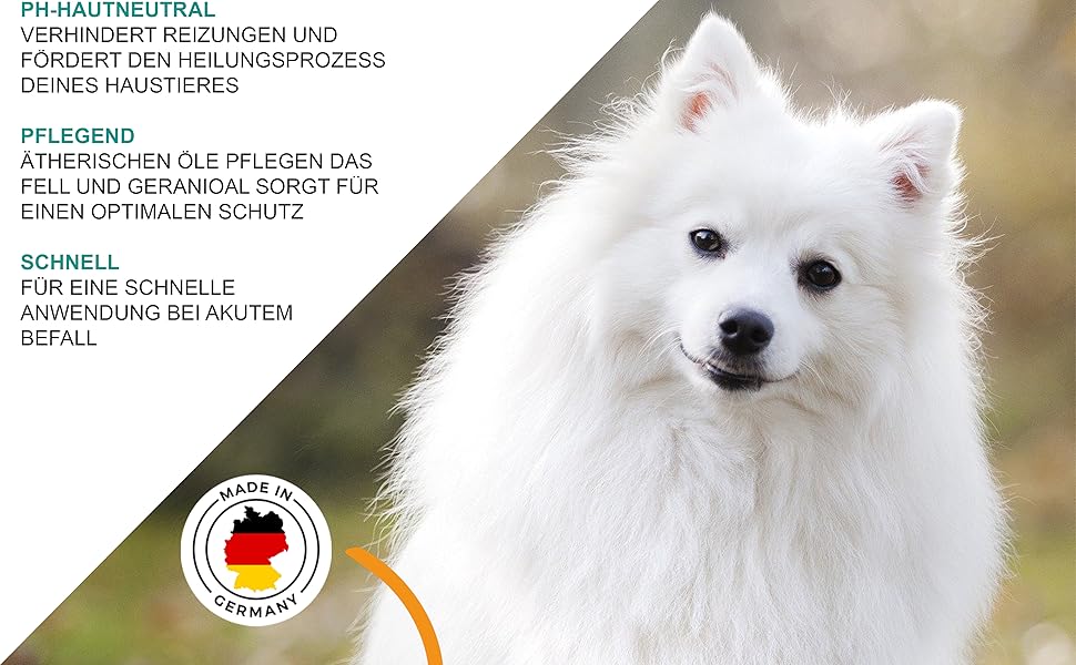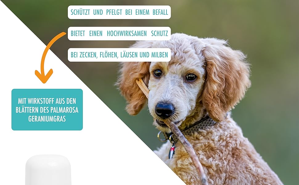 • Natürliche Inhaltsstoffe: Mit Geraniol, Teebaumöl und weiteren wertvollen Ölen für gesunde Haut und glänzendes Fell.