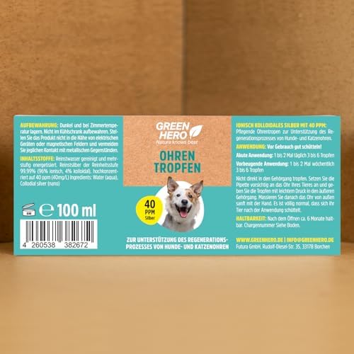 Entdecken Sie die fortschrittlichen Ohrentropfen mit 40 PPM Silberlösung und Reinstwasser, speziell entwickelt für die schonende und effektive Pflege der Ohren Ihres Hundes oder Ihrer Katze. Diese Tropfen sind besonders geeignet für Tiere mit empfindlicher Haut und bieten eine optimale Versorgung für gereizte oder juckende Ohren.