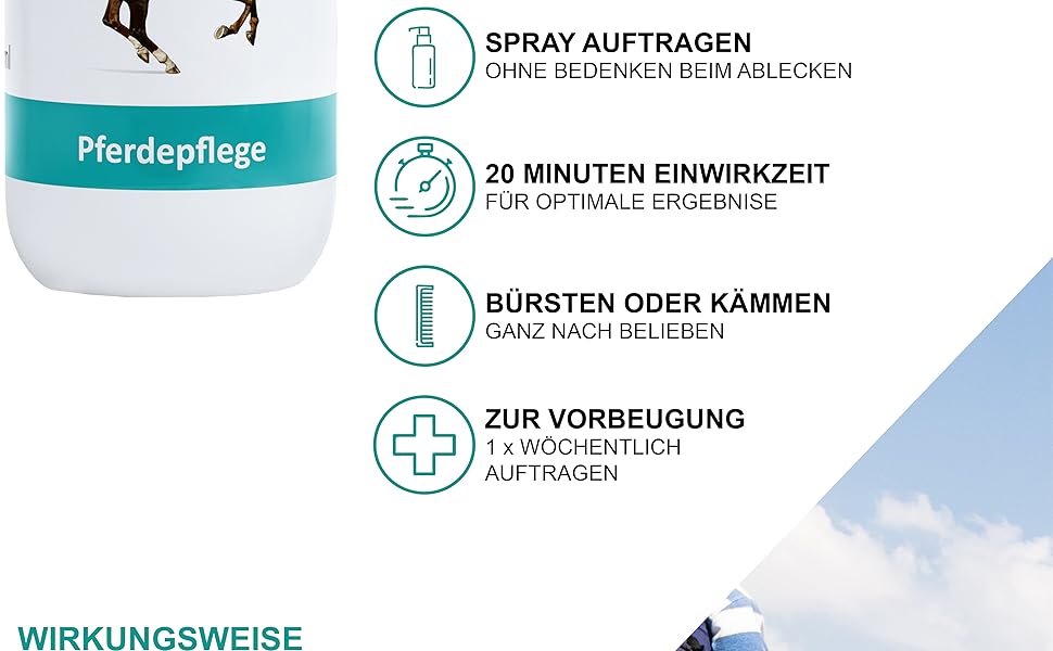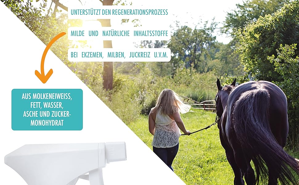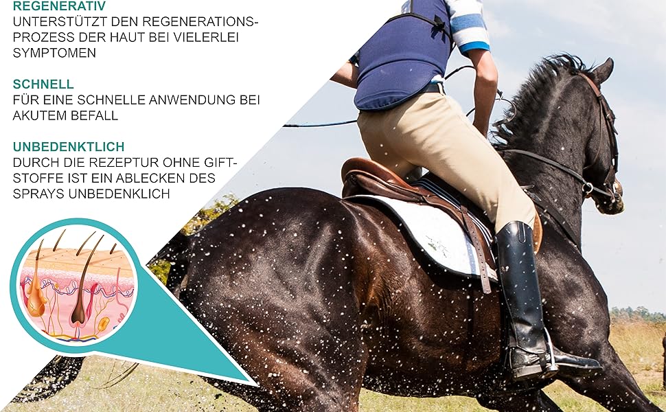 - Hautregeneration: Speziell für die Behandlung von Hautproblemen wie Sommerekzemen, Räude und Juckreiz konzipiert, fördert das Spray die schnelle Regeneration geschädigter Haut.