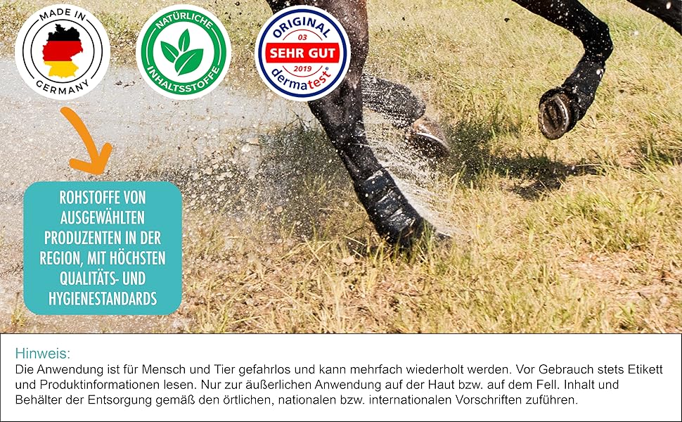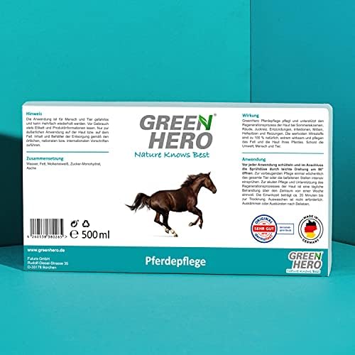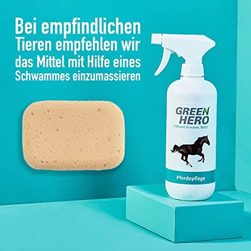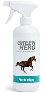 - Natürliche Inhaltsstoffe: Die Green Hero Pferdepflege verwendet ausschließlich hautfreundliche, natürliche Inhaltsstoffe, die Ihre Pferdehaut sanft unterstützen.