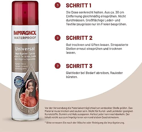 Das Imprägnierspray lässt sich leicht auftragen und zieht schnell in das Material ein, ohne einen unangenehmen Geruch zu hinterlassen. Die Anwendung ist einfach und unkompliziert, was eine gleichmäßige Bedeckung aller betroffenen Oberflächen ermöglicht. So können Sie sicher sein, dass Ihre Kleidung, Schuhe, Taschen und Rucksäcke bestens geschützt sind.