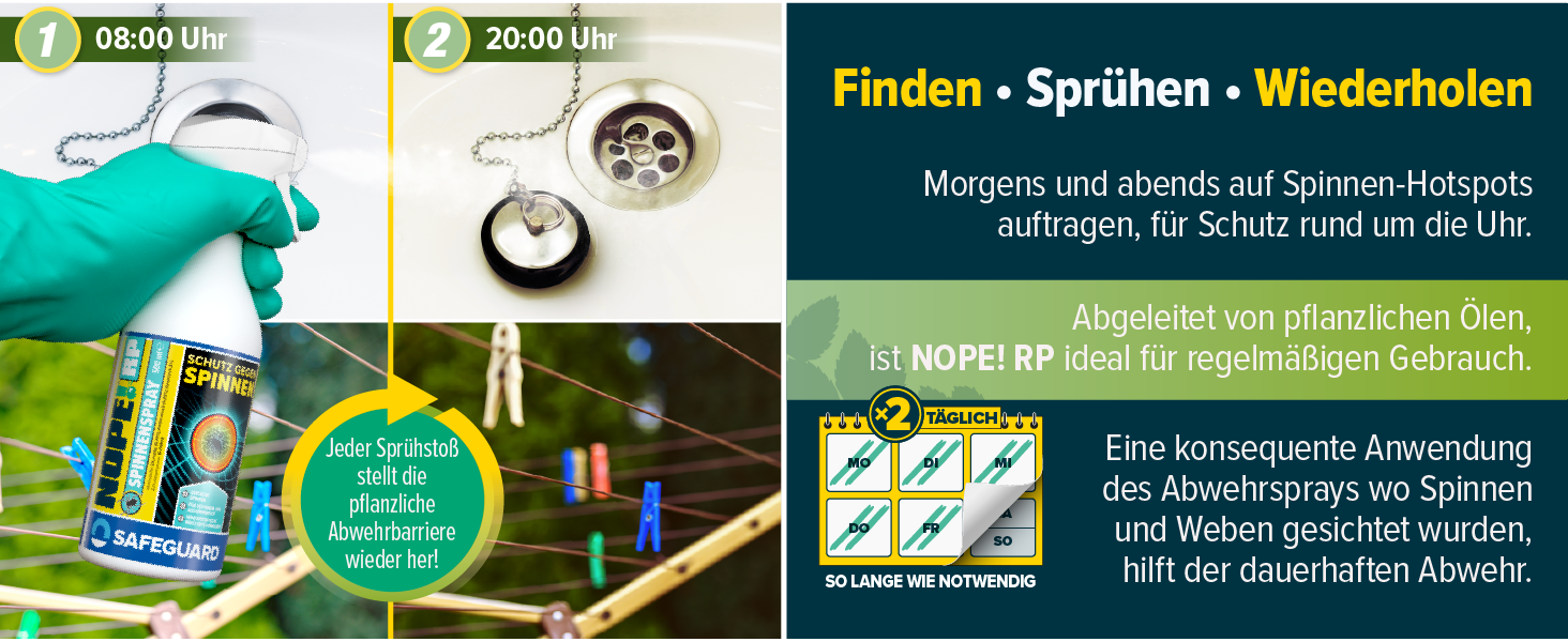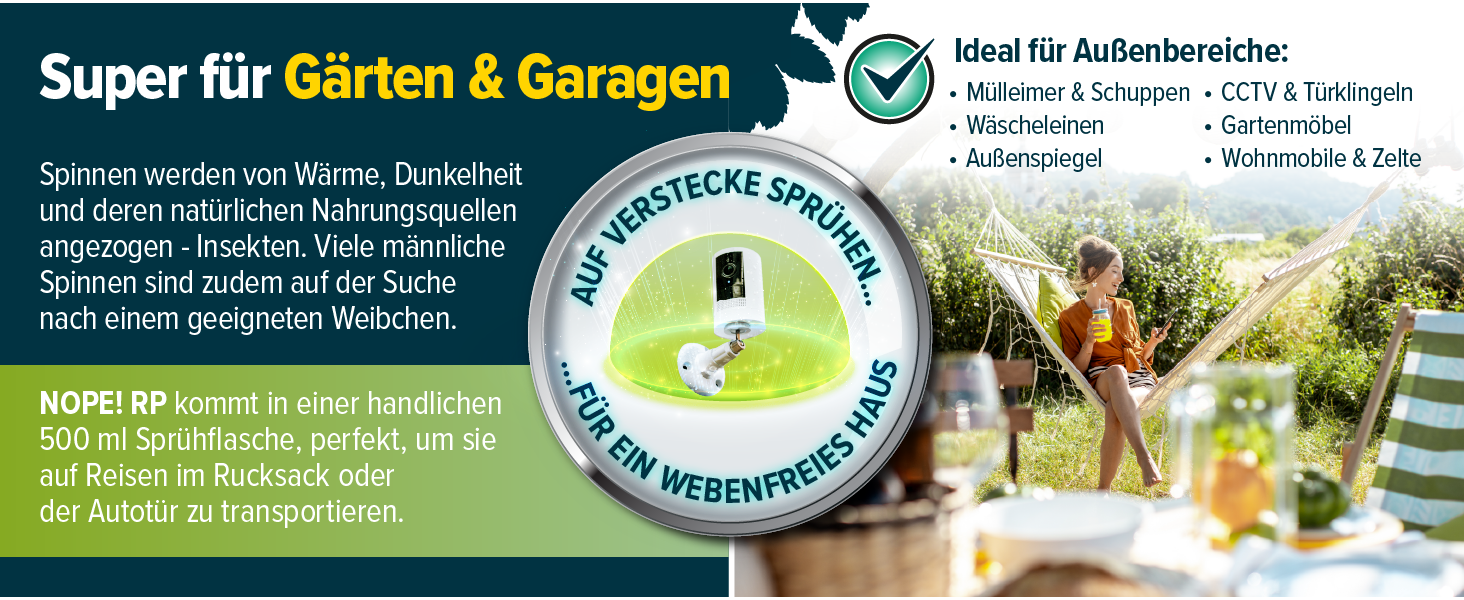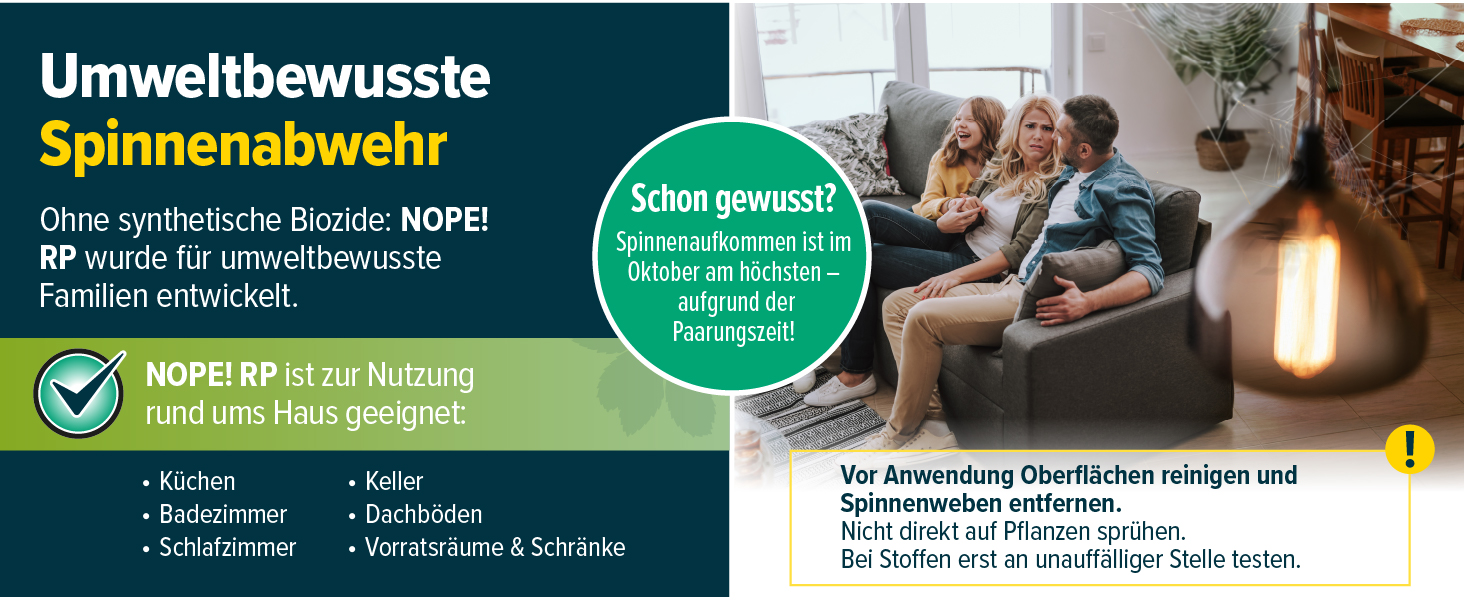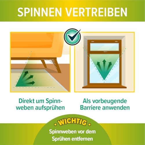 Dieses Mittel ist sowohl für Innen- als auch Außenbereiche geeignet. Es schützt Ihre Wohnräume, Schuppen, Außenbereiche, Überwachungskameras und Garagen effektiv vor unerwünschten Spinnen. Nutzen Sie unsere Spinnenabwehr überall dort, wo Sie sich Wohlfühlen möchten.