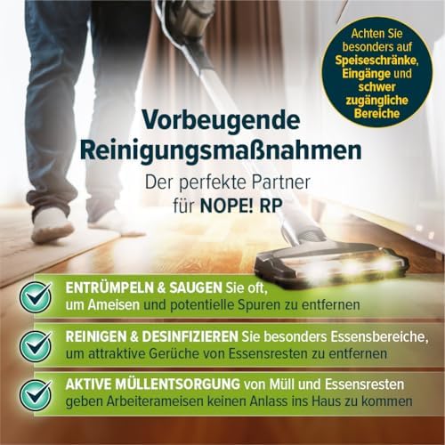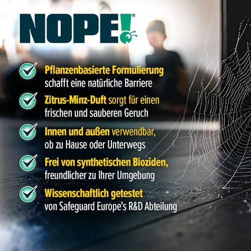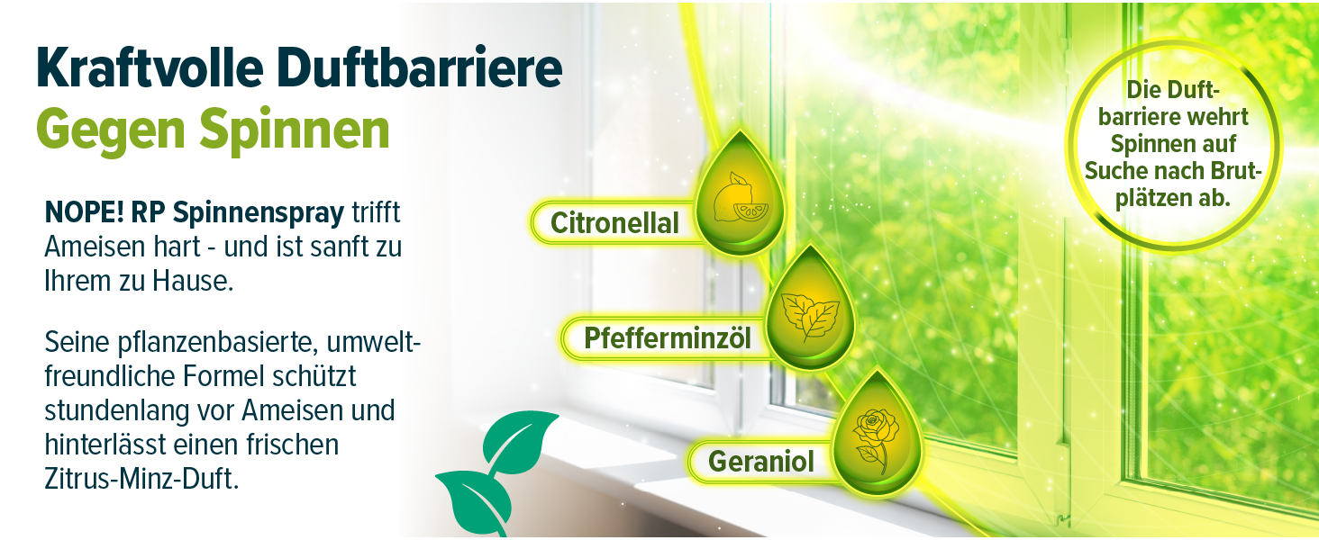 Unser Spinnenabwehrmittel vertreibt Spinnen auf natürliche Weise und verwendet hochwirksame, pflanzenbasierte Inhaltsstoffe wie Citronellal, Pfefferminzöl und Geraniol. Diese natürlichen Komponenten sind nicht nur effektiv, sondern auch umweltfreundlich, sodass Sie sich ohne Bedenken in Ihrer Umgebung aufhalten können.