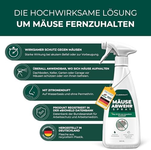 Silberkraft Mäuseabwehr Spray 500 ml – Effektiver Mäuseschutz für Keller, Garage und Haus mit SofortwirkungSilberkraft Mäuseabwehr Spray 500 ml – Effektiver Mäuseschutz für Keller, Garage und Haus mit Sofortwirkung